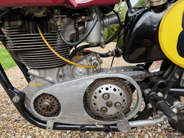 Workshop inspection now completed and it is clear that this machine has been properly decommissioned for storage/ display. Alloy fuel tank is clean and empty, same as the oil tank, oil feed and return pipes blanked off and everything inside is clean, oiled and free-moving. Good compression and a very healthy spark from the Lucas competition magneto. There is a workshop report available and we feel strongly that it will recommission with the minimum of attention but we’re not going to go any further because we know that the next owner will probably want to inspect and decide for themselves what to do and what not to do. We will recommission if asked to of course, at cost. It will be loud!