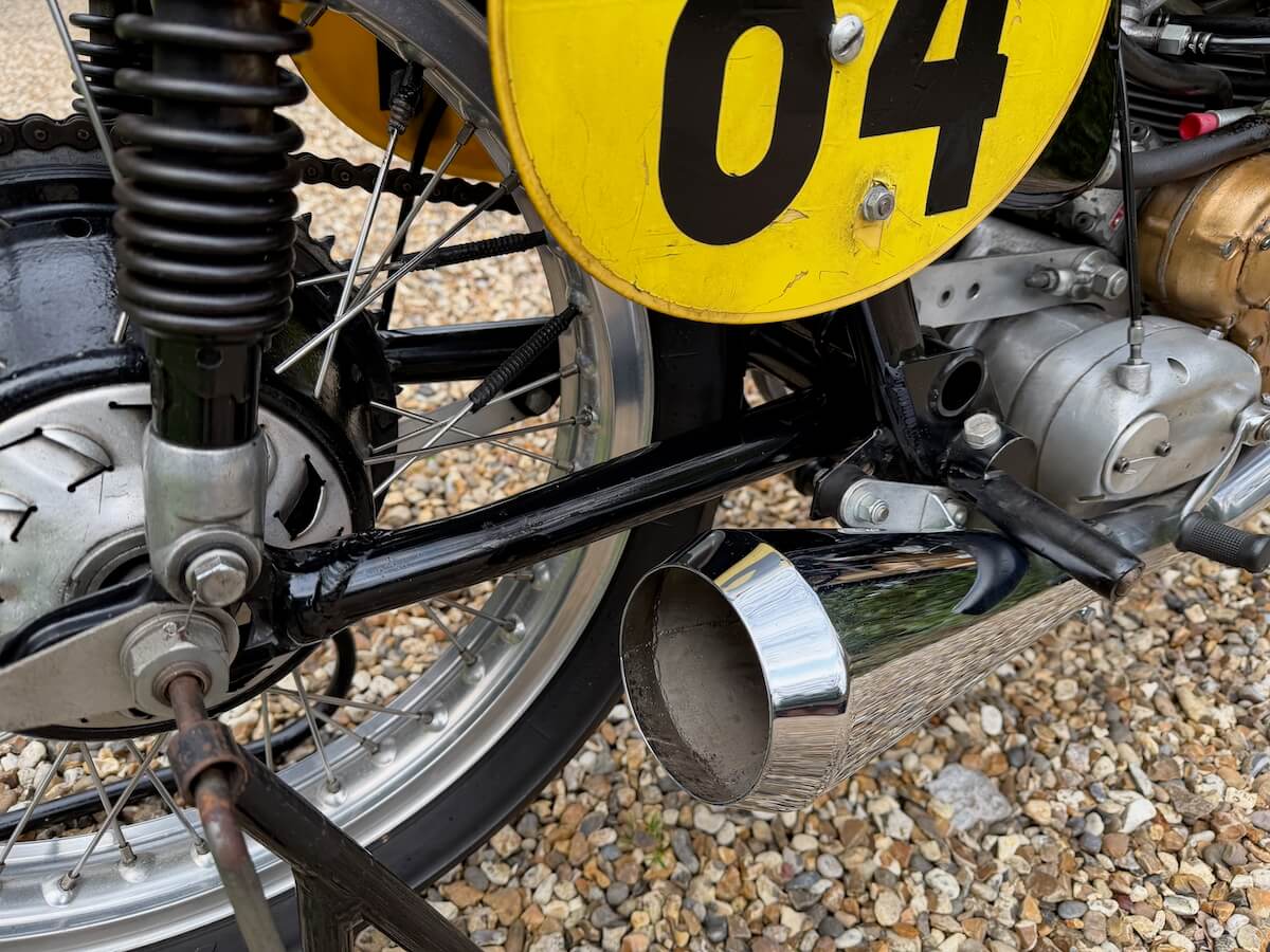 Workshop inspection now completed and it is clear that this machine has been properly decommissioned for storage/ display. Alloy fuel tank is clean and empty, same as the oil tank, oil feed and return pipes blanked off and everything inside is clean, oiled and free-moving. Good compression and a very healthy spark from the Lucas competition magneto. There is a workshop report available and we feel strongly that it will recommission with the minimum of attention but we’re not going to go any further because we know that the next owner will probably want to inspect and decide for themselves what to do and what not to do. We will recommission if asked to of course, at cost. It will be loud!