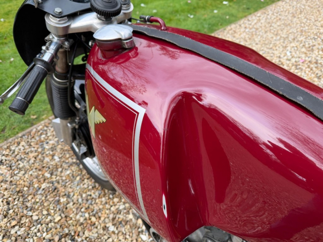 Workshop inspection now completed and it is clear that this machine has been properly decommissioned for storage/ display. Alloy fuel tank is clean and empty, same as the oil tank, oil feed and return pipes blanked off and everything inside is clean, oiled and free-moving. Good compression and a very healthy spark from the Lucas competition magneto. There is a workshop report available and we feel strongly that it will recommission with the minimum of attention but we’re not going to go any further because we know that the next owner will probably want to inspect and decide for themselves what to do and what not to do. We will recommission if asked to of course, at cost. It will be loud!