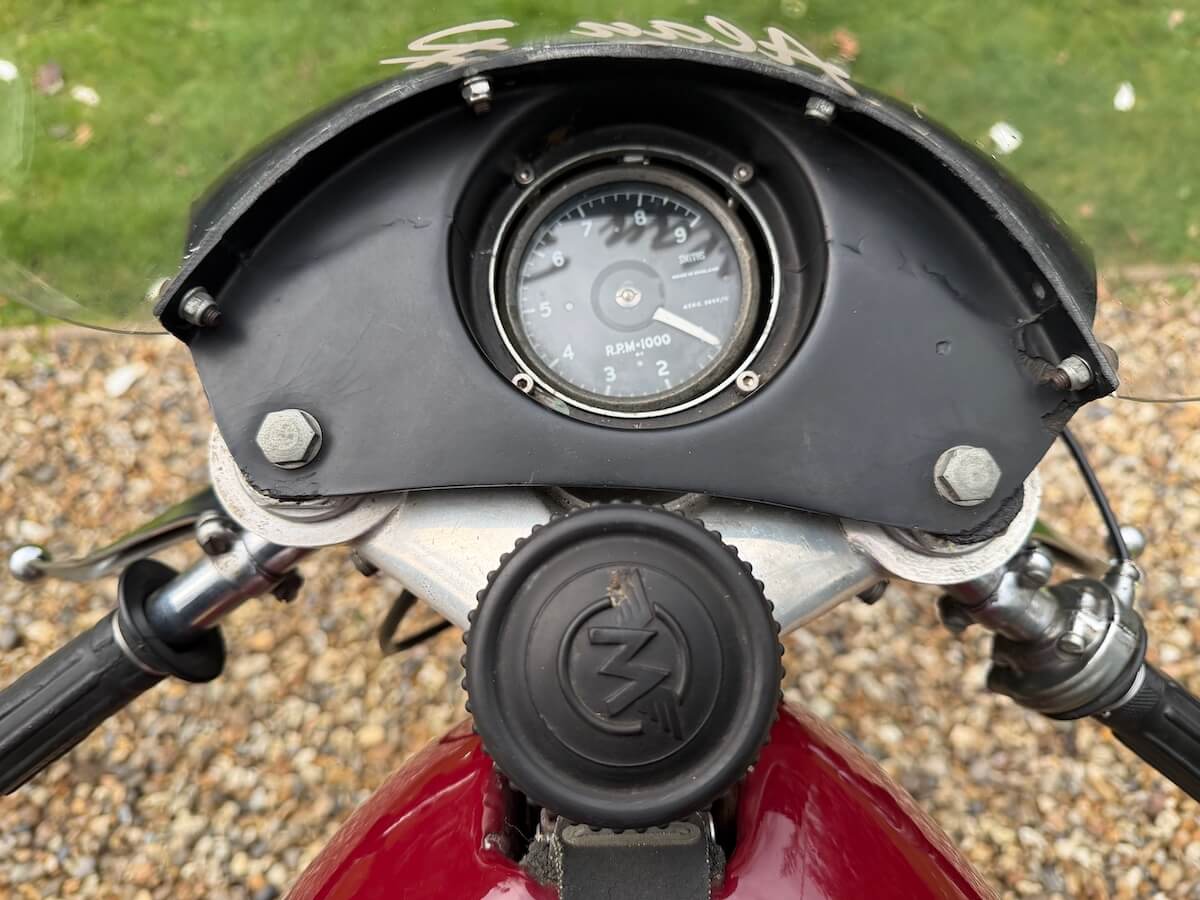 Workshop inspection now completed and it is clear that this machine has been properly decommissioned for storage/ display. Alloy fuel tank is clean and empty, same as the oil tank, oil feed and return pipes blanked off and everything inside is clean, oiled and free-moving. Good compression and a very healthy spark from the Lucas competition magneto. There is a workshop report available and we feel strongly that it will recommission with the minimum of attention but we’re not going to go any further because we know that the next owner will probably want to inspect and decide for themselves what to do and what not to do. We will recommission if asked to of course, at cost. It will be loud!