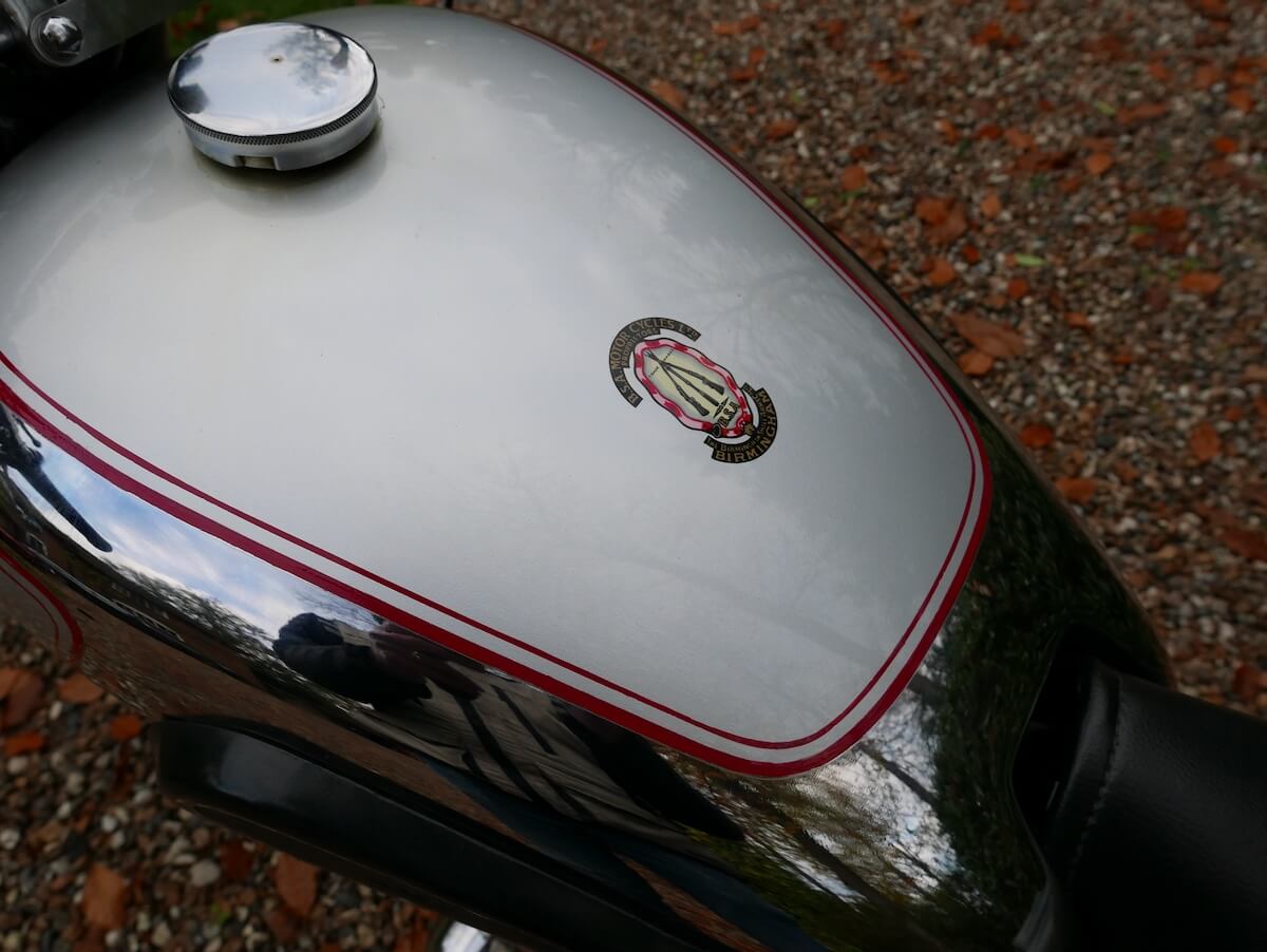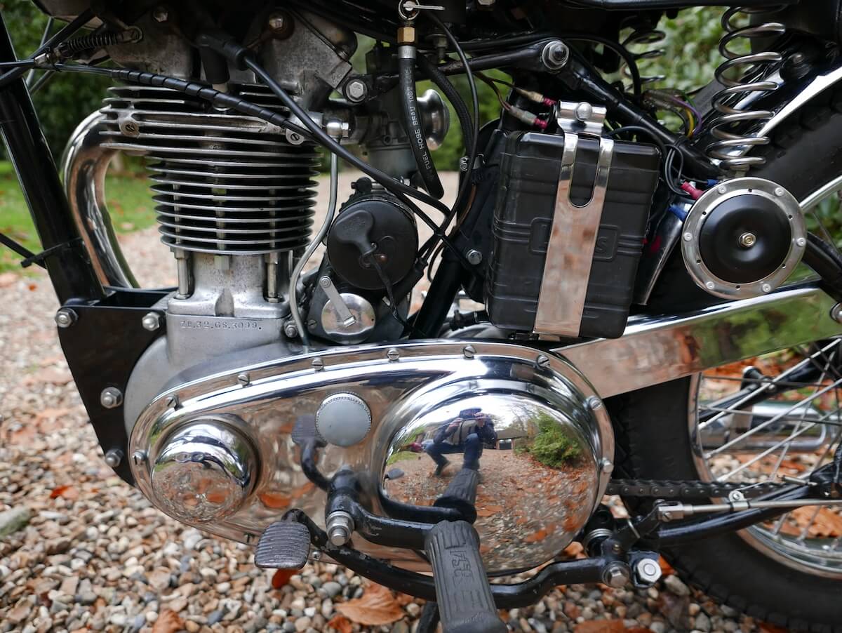 A very nicely presented 1949 350cc Gold Star and in fine mechanical condition too. With the ignition timing set correctly it performs extremely well, starts easily and idles perfectly with the manual advance/retard lever set to full retard. There is a generous amount of advance/retard travel on the magneto which results in the engine rather too willing to rev when the lever is set to full advance, as demonstrated in the video. In practice one rides with the lever in a restricted range and even then you have the pleasure of using such responsiveness as a kind of second throttle. Classic Bike Workshop will mark the usable range on the lever as they often do for the new owner. The bike comes with a history of recent engine and gearbox work which is documented and explains the excellent performance. It has clearly had more money thrown at it in restoration work too, lots of new parts and it does demonstrate how pretty these early tele-rigid Goldies can be. Fitted with a later Amal Concentric carburettor and running well on it. The document file includes some invoices, service manual and instruction sheets for this model, along with the V5C of course. There is also a VMCC dating letter confirming that both engine and frame are of 1949 manufacture (it is a replacement engine though) and it is a B32 not a B31 so it’s the real deal. Both frame and engine numbers are clearly visible and pictures will be provided on request.