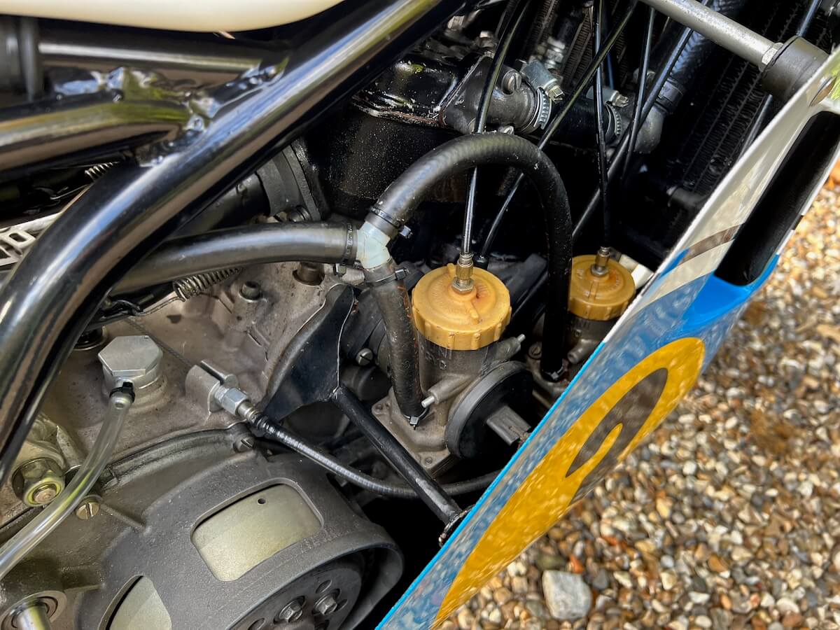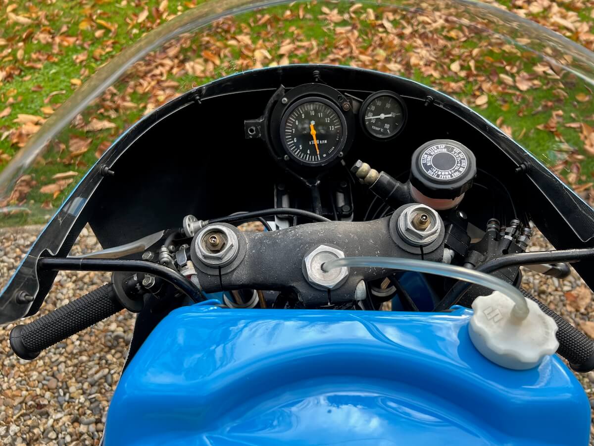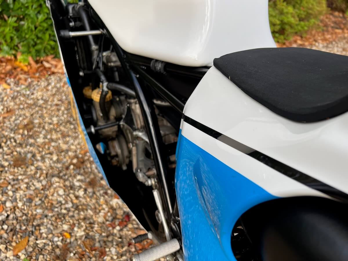 A championship winning race machine in partly restored condition, sold as is but was reportedly running well when laid up with fluids drained for display years ago. This is the ex Leanardo Becheroni RG500 from 1981, in which year he won the first EU GP500 Championship on this bike. He also won the Italian 500 class in 1983 on this same machine. Sadly Leonardo died in 1983 so he’s no longer around to tell the tale but fine racing machines tell their own story and there are none finer than the iconic RG500 square four stroker that won so many races in this era of motorcycle racing. Frame and engine numbers define it as a matching numbers mk6 model, factory records don’t tell us the exact production numbers but average over the model years was around 100 per year so it is a rare old thing. Now it is here and with a closer look it is clear that the frame has been restored and is in exceptionally good condition. The fairing is a display fit and recently painted too. Wheels look like they have had a blow over as well probably. The engine on the other hand looks like it was raced last week! We haven’t even tried to recommission it and although everything appears to work it has been standing so long that a complete strip and refresh is the only way to go with this one, to be safe. A truly lovely race bike with history. Comes with paddock stand. Pictures of frame and engine numbers on request.