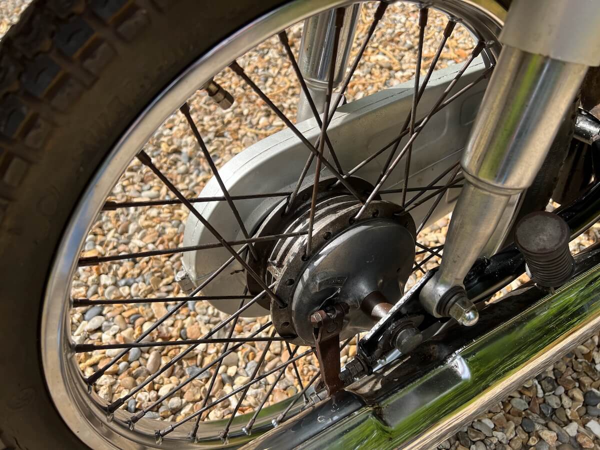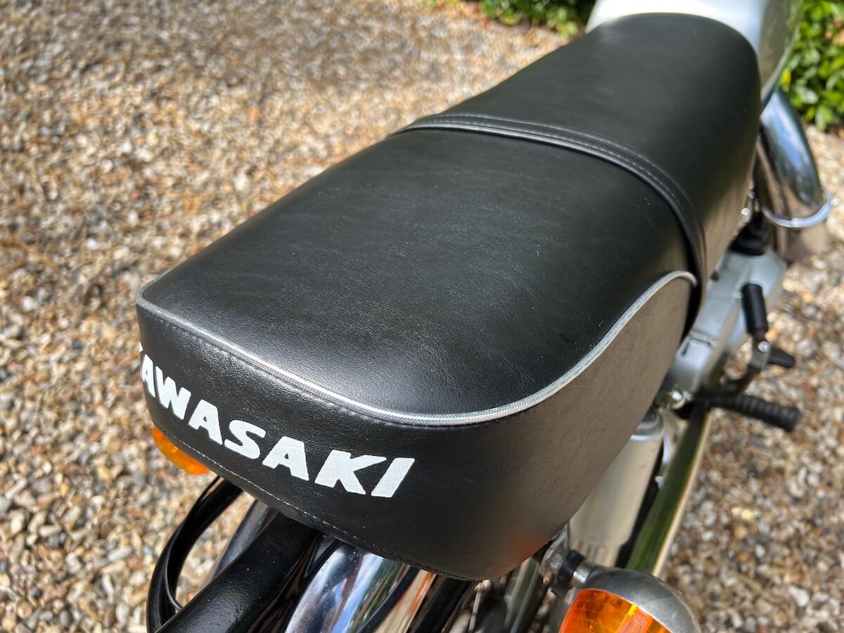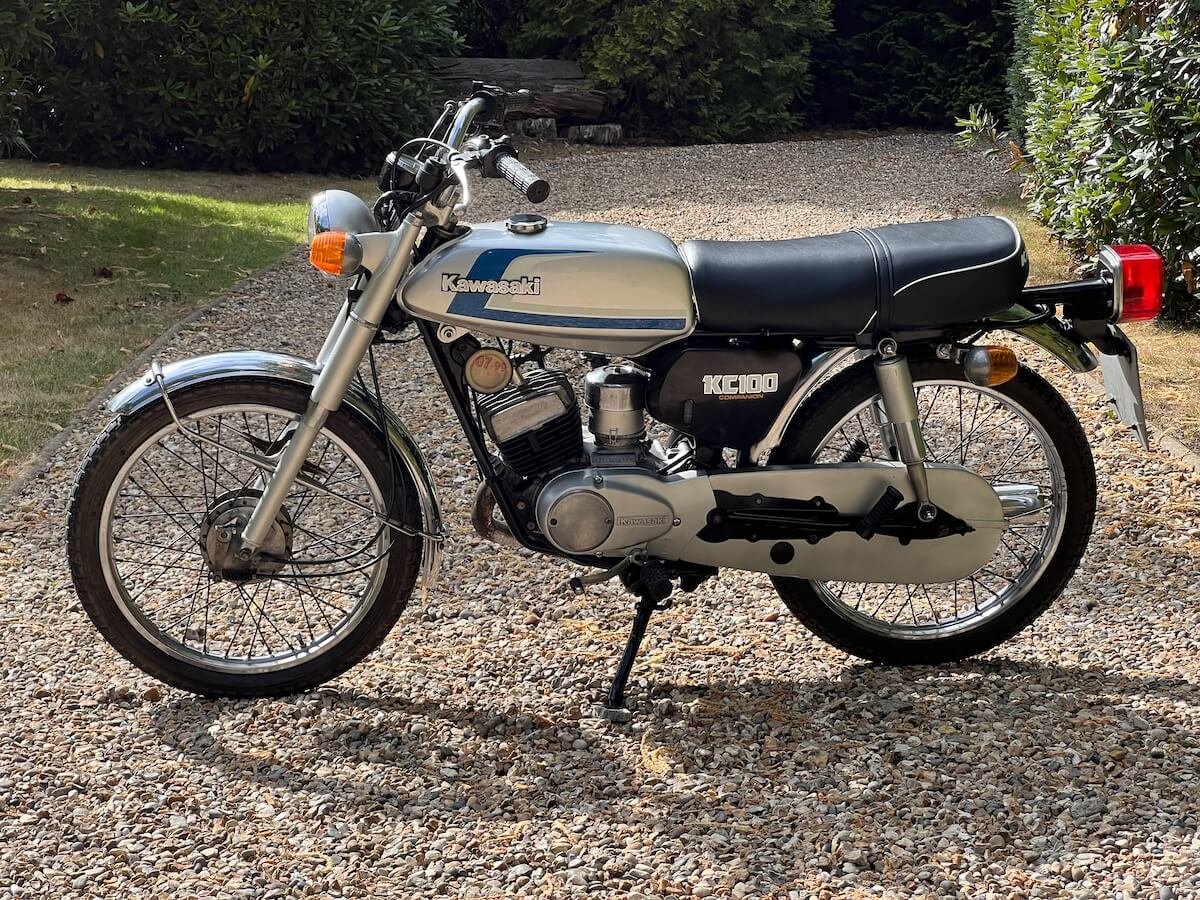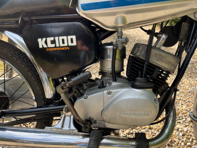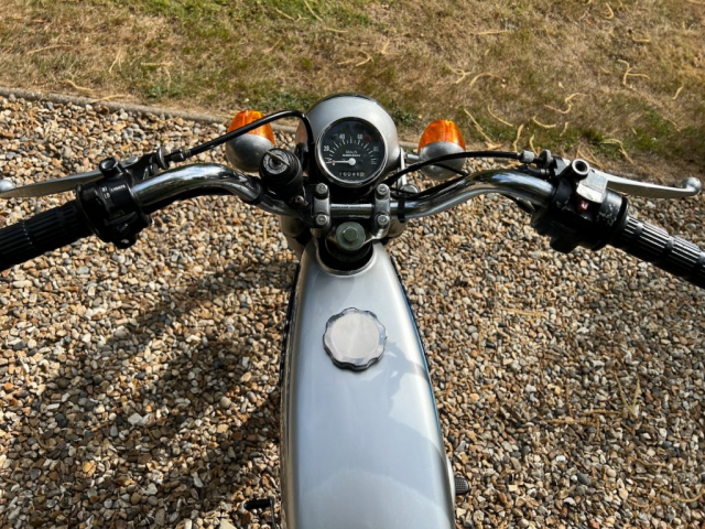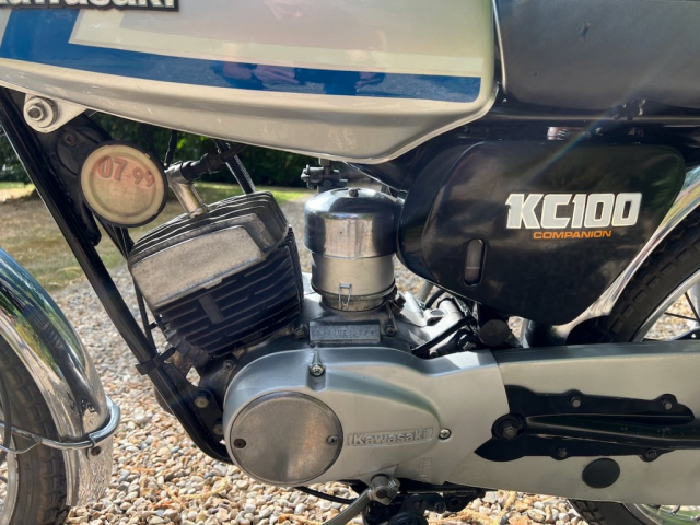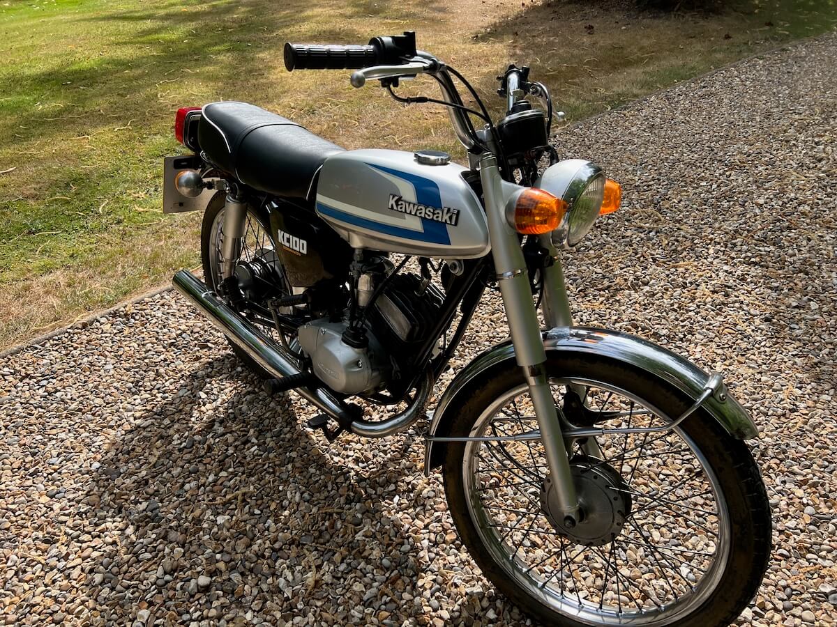 A remarkably quick little 100cc two-stroke single (auto-lube) from Kawasaki. Two owners from new in the UK, original engine (matching numbers – they are close on a Kawasaki not the same), original registration and some history including an old V5 registration document. New V5C correctly states historic status and Classic Bike Workshop have spent way too much time making everything work to MOT standards. Even the clutch-pull side stand works now. Nicely preserved and with some recent tidying such as a new seat cover, it offers light weight and peppy performance in a classic machine that brakes and handles well without any of the complexity of later machines. Improvement opportunities to note would be the poor paintwork on the headlamp and old tyres; while having enough tread; could do with replacing really. Had to stop somewhere. A nice machine with some fettle potential.