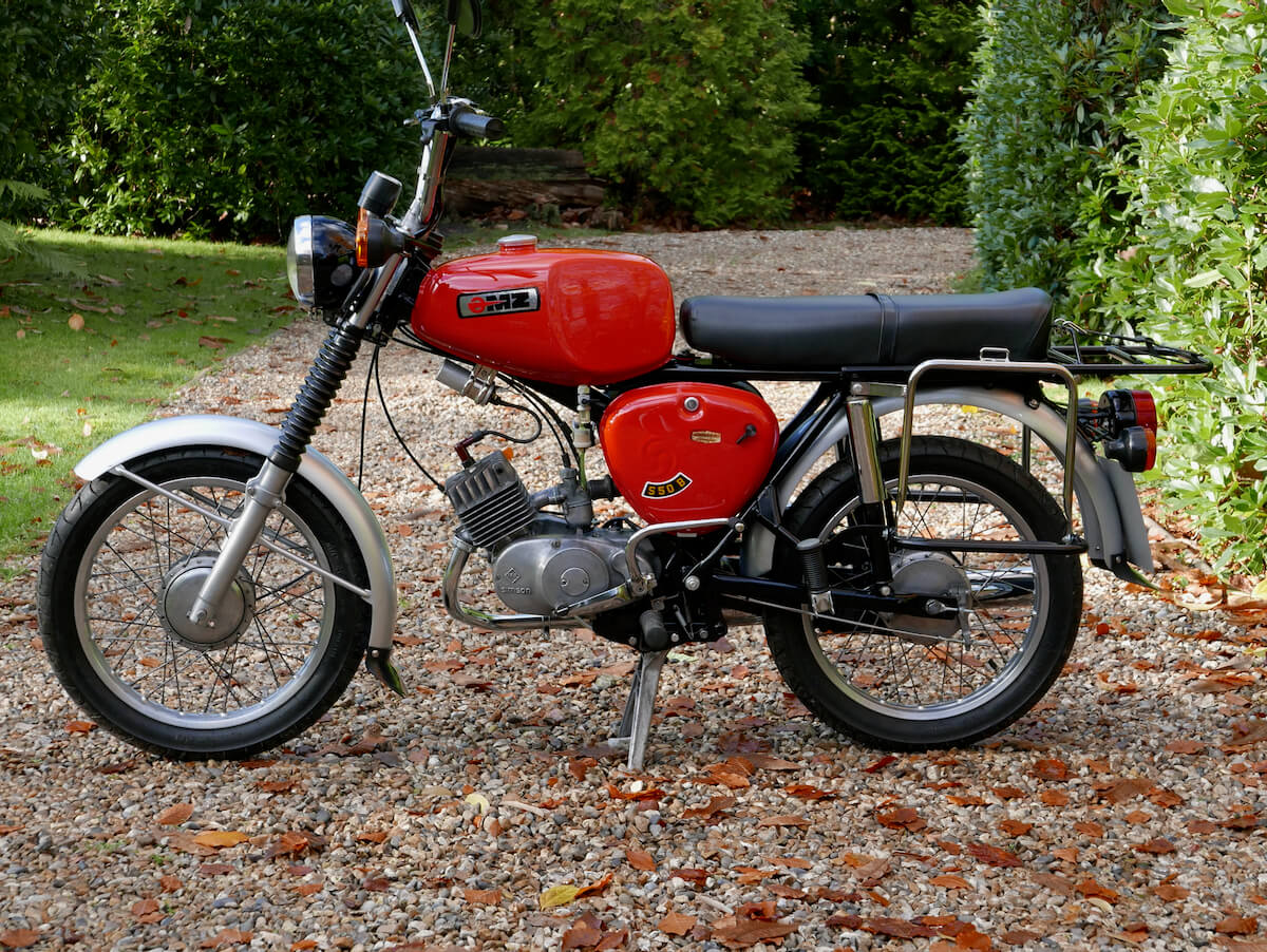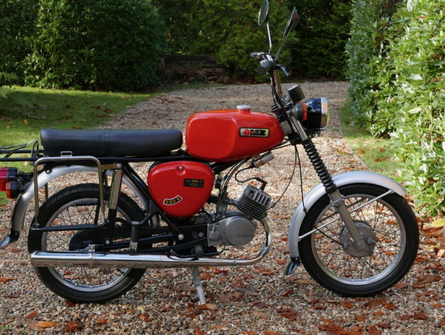 A beautifully restored and rebuilt UK model Simson S50 B1 from a very good home where it has had a nut and bolt refurbishment and complete professional re-spray top-to-bottom. Classic Bike Workshop couldn’t resist having a look for the source of a little top-end rattle and replaced the small-end bearing and base gasket and it is super-quiet now. In fact the engine internals passed close examination and we can confirm that the bottom end is perfect and the piston/bore similarly serviceable. As you can hear in the video all is well mechanically and as you can see it is a beautiful period machine from 1978 when these models were actually very competitive in the hotly-contested moped performance stakes. Complete with new soft panniers; we left the frames on but they are easily removed if you want that absolutely standard model look.